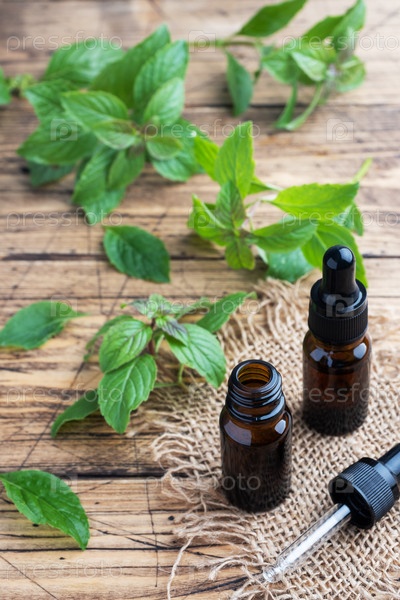 Ароматное эфирное масло мяты в темных стеклянных пузырьках, ароматерапевтическое масло, натуральная органическая косметика на деревенском деревянном фоне