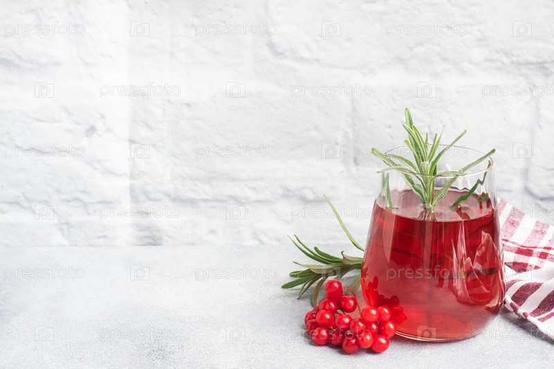 Напиток из ягод калины красной в стеклянной чашке. Ягодный компот с витамином С против простуды. Копирование пространства