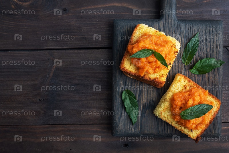 Сэндвич с тостами и кабачковой икрой. Овощная икра на хлебе, здоровая вегетарианская закуска. копировать пространство