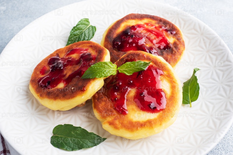 Оладьи из творога с черничным джемом. Сырные сырники, блины на сером бетонном фоне