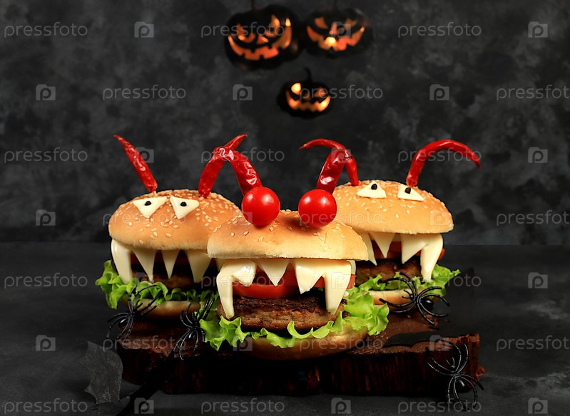 Концепция еды на Хэллоуин. Страшные гамбургеры со свежим салатом, помидорами, сливочным сыром, салатом, луком, котлетами и перцем в виде рогов на старом бетонном фоне, реклама кафе, меню,