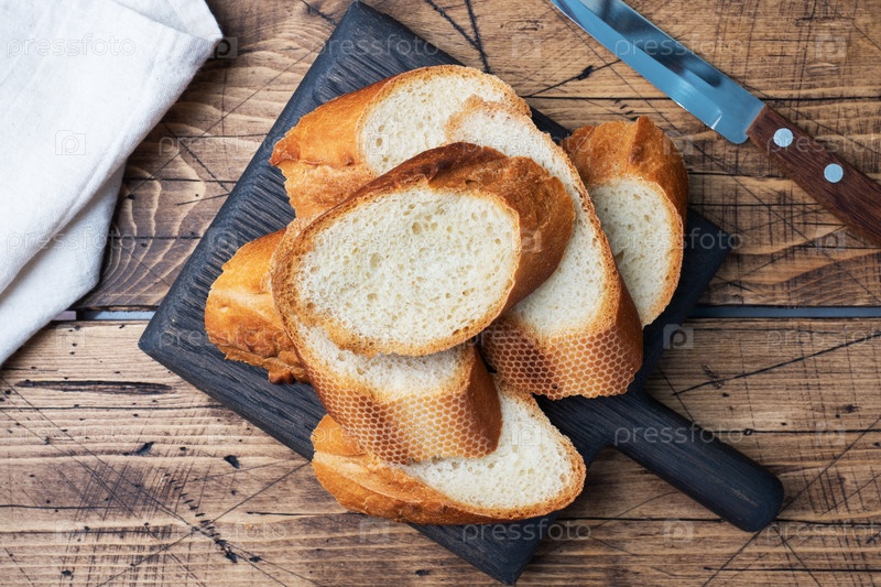 Свежий багет из белого хлеба нарезают на деревянной разделочной доске