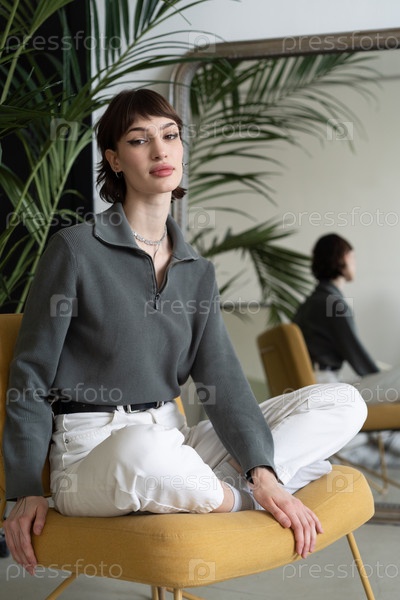 Молодая красивая женщина сидит в кресле в студии в свитере