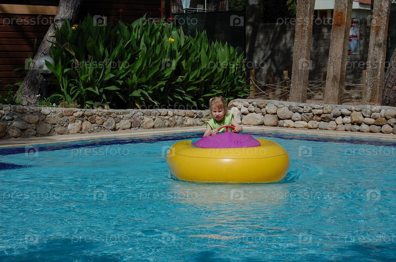 Маленькая девочка 4-6 лет катается на надувной лодке. Отдых, праздники