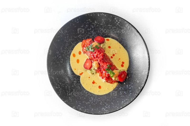 Тартар из лосося с клубникой и нитями чили на черной тарелке