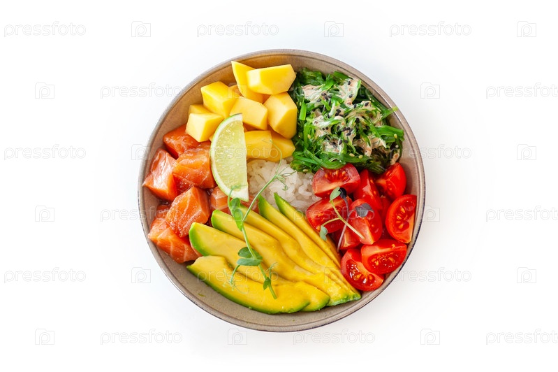 Поке-миска с лососем изолирована на белом фоне. Вид сверху
