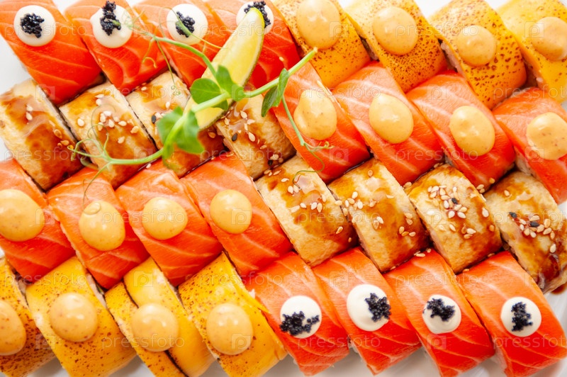 Ассорти суши большой набор фона крупным планом. Разнообразие японских суши