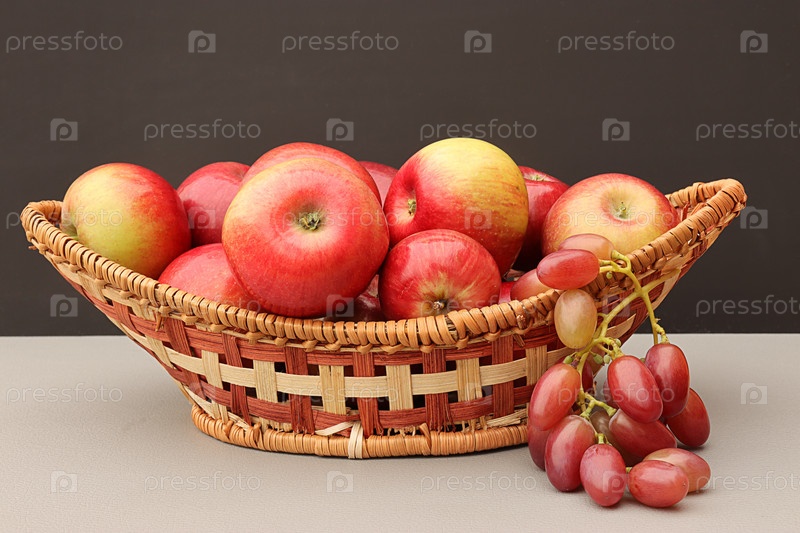 Яблоки и виноград в плетеной деревянной корзине на столе