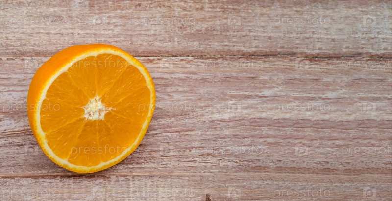 Половина апельсина на деревянном столе. Баннер с оранжевым. Апельсин на деревянном фоне