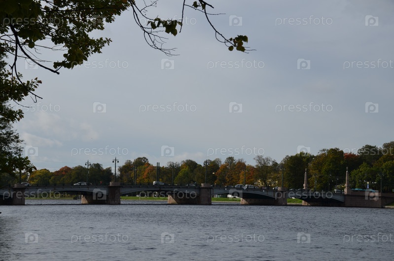 Вид на Каменноостровский мост и набережную реки Малой Невки в Санкт-Петербурге в осенний день