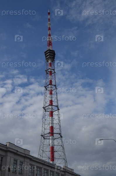Санкт-Петербургская телебашня на Аптекарском острове на фоне голубого неба с облаками