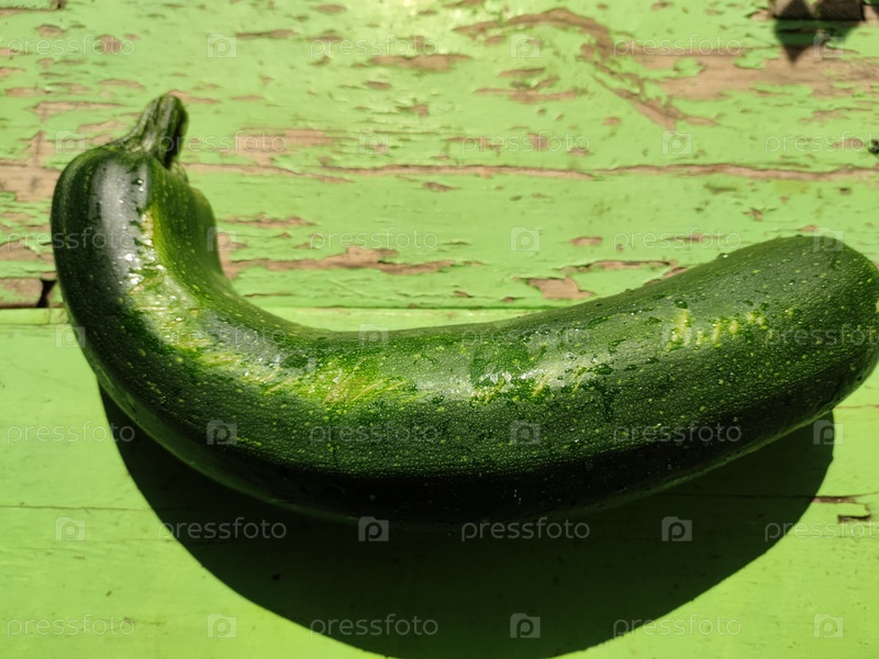Длинный изогнутый зеленый кабачок. Солнце освещает неровные зеленые крапчатые кабачки на кожице овоща каплями воды и легкими потертостями. Кабачки лежат на светло-зеленой деревянной поверхности