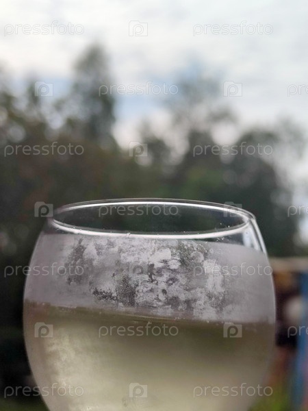 Холодное белое вино в стакане. В прозрачном, запотевшем стеклянном кубке с ножкой холодное белое вино слегка желтоватого цвета. Стакан находится на зеленом столе. Вино с мелкими пузырьками воздуха