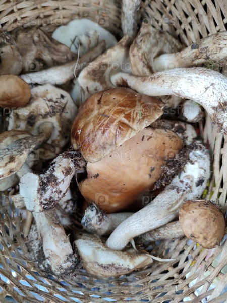 В корзине лежат белые грибы. В плетеной коричневой корзинке лежат крупные грибы с коричневой шляпкой и белой ножкой. На грибах видны следы земли и лесного мха