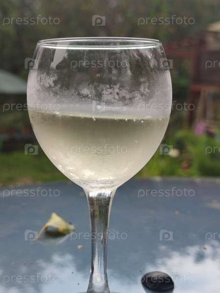 Холодное белое вино в стакане. В прозрачном, запотевшем стеклянном кубке с ножкой холодное белое вино слегка желтоватого цвета. Стакан находится на зеленом столе. Вино с мелкими пузырьками воздуха
