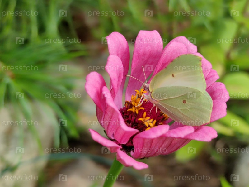 Насекомое в центре розового цветка. Большой раскрытый цветок циннии розового цвета, сердцевина цветка желтая. Бабочка со светло-зелеными крыльями сидит в цветке и собирает из него нектар.Крушинница