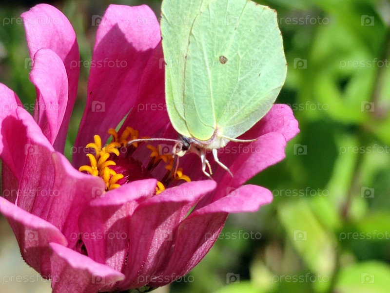 Насекомое в центре розового цветка. Большой раскрытый цветок циннии розового цвета, сердцевина цветка желтая. Бабочка со светло-зелеными крыльями сидит в цветке и собирает из него нектар