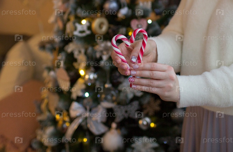 Крупный план женских рук, держащих сладости в форме сердечек. Сладости в руках женщины в помещении. Малая глубина резкости с акцентом на руки и ногти