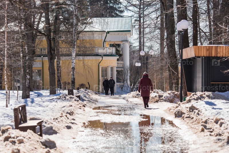 Ленинский исторический музей-заповедник «Горки» — музей В.И. Ленина, где в 1924 году умер советский лидер. Архитектура парка. Популярная туристическая достопримечательность. Март 2023 года, Московская область