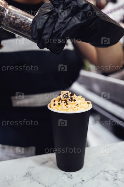 Крупным планом черный бумажный стаканчик с молочным напитком со взбитыми сливками и шоколадом