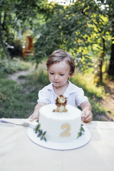 Милый малыш с волнистыми волосами и белой рубашкой сидит за столом и смотрит на праздничный торт на открытом воздухе