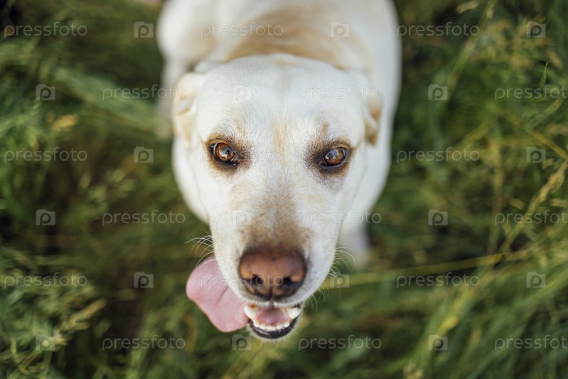 Крупный план золотистого лабрадора в природе. Красивая домашняя собака