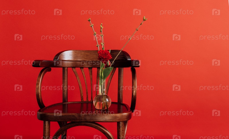 Замечательная цветочная композиция в стеклянной вазе. Красивый букет красного тюльпана и ветвей с бутонами на деревянном классическом стуле