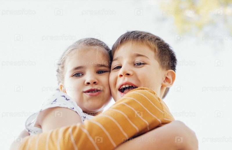 Маленькие милые дети в повседневной одежде крепко обнимают друг друга. Красивая девочка и мальчик улыбаются и смотрят в камеру