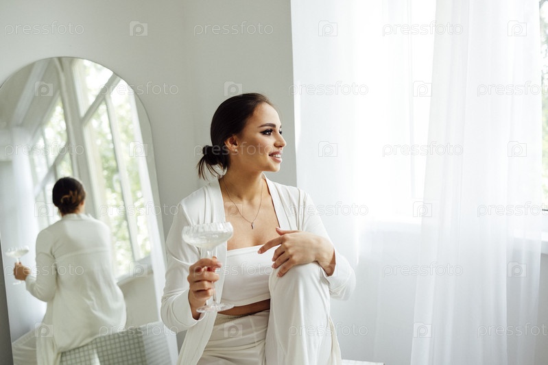 Молодая женщина с вечерним макияжем и в белой одежде сидит с бокалом шампанского