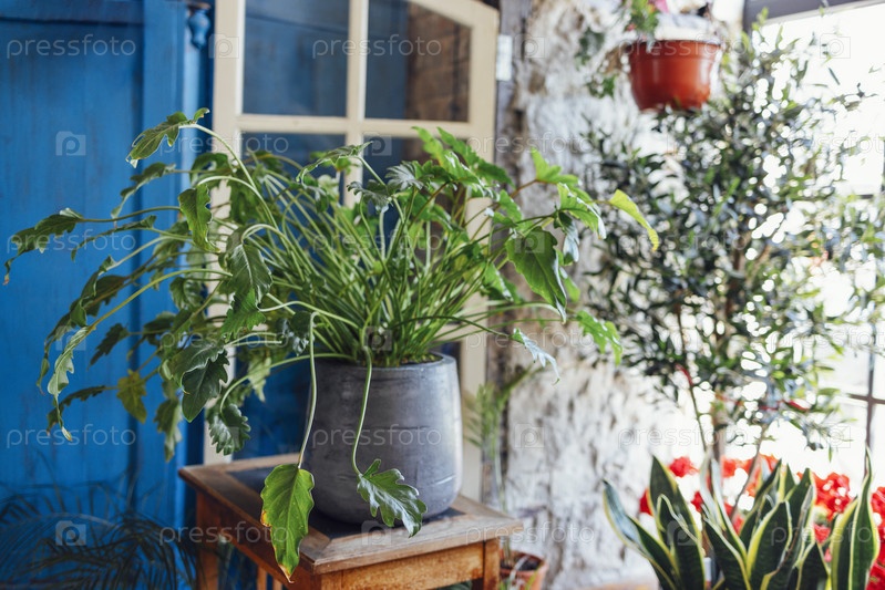 Крупным планом горшок с зеленым комнатным растением на деревянном столе в стиле ретро