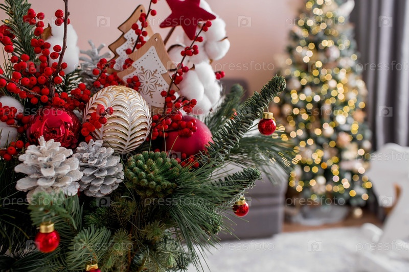 Букет елей с красными ягодами, хлопком, игрушками на столе на фоне елочных гирлянд. Зимние украшения в интерьере. Концепция подготовки к новогодним праздникам 2024