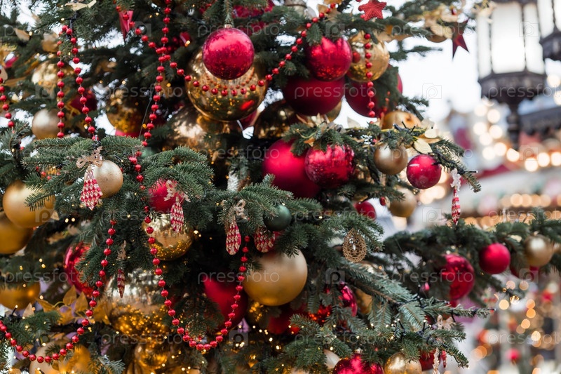 Москва, Площадь Революции. Рождественское украшение улиц. Красивые праздничные украшения на елке в традиционных красных и золотых тонах. Новогодняя открытка 2024