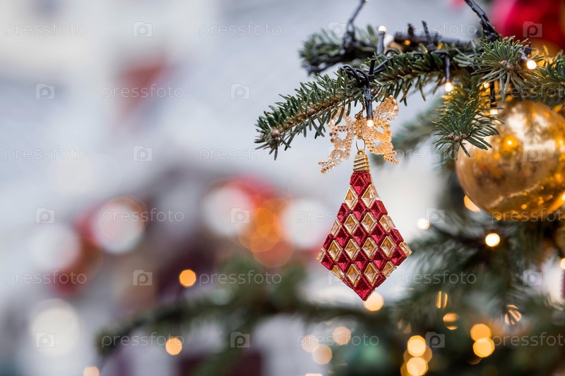 Москва, Площадь Революции. Рождественское украшение улиц. Красивые праздничные украшения на елке в традиционных красных и золотых тонах. Новогодняя открытка 2024