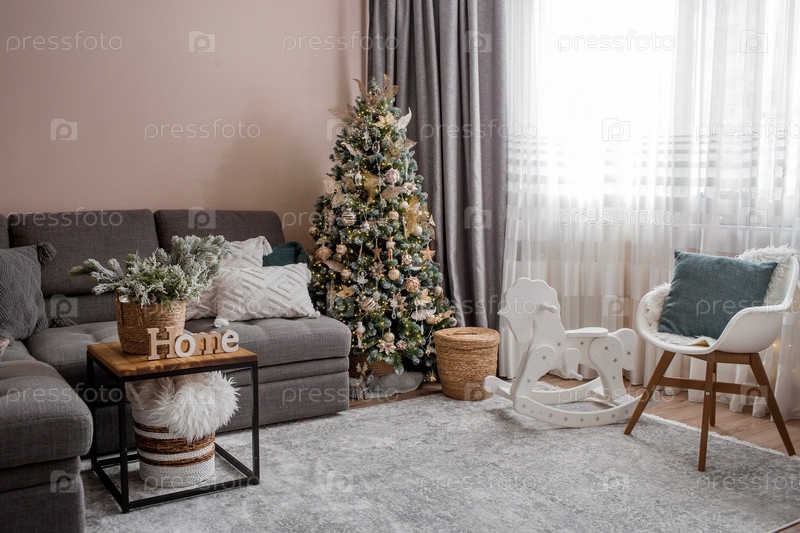 Новогодние праздники 2023. Уютный декор в серо-зеленых тонах в интерьере рождественской комнаты, елка, украшенная гирляндами, подарки, деревянная лошадка. Праздничная гостиная в доме