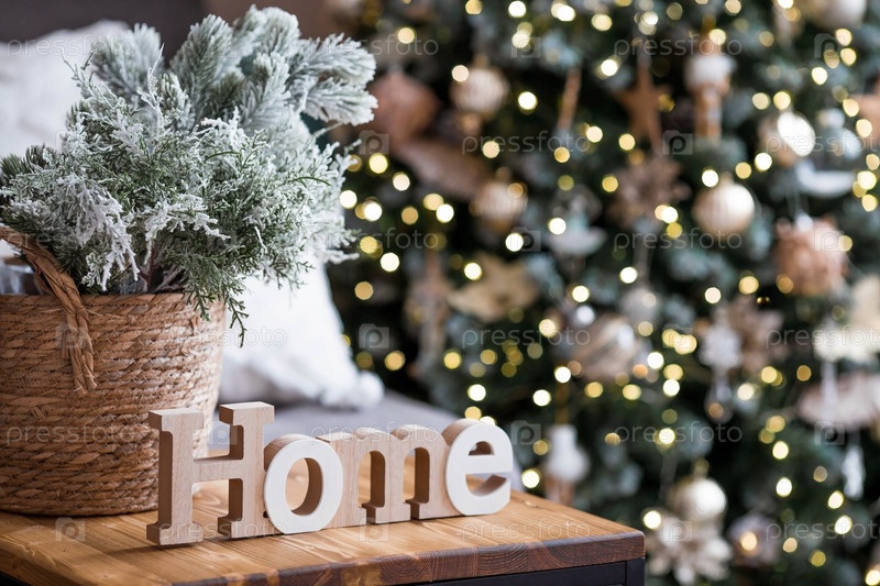 Красивая праздничная открытка. Концепция счастливого Нового года и Рождества 2024 года. Рождественские елки и домашний знак на деревянном столе в уютной гостиной