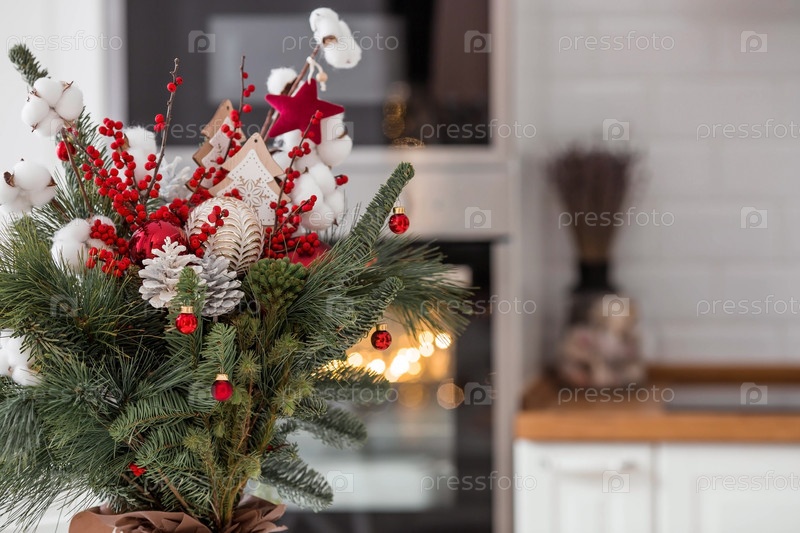 Еловый букет с красными ягодами, игрушками, хлопком на белом кухонном столе. Новогодние украшения в интерьере. Концепция подготовки к новогоднему празднику 2024