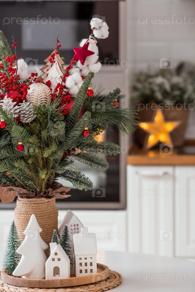 Еловый букет с красными ягодами, игрушками, хлопком на белом кухонном столе. Новогодние украшения в интерьере. Концепция подготовки к новогоднему празднику 2024