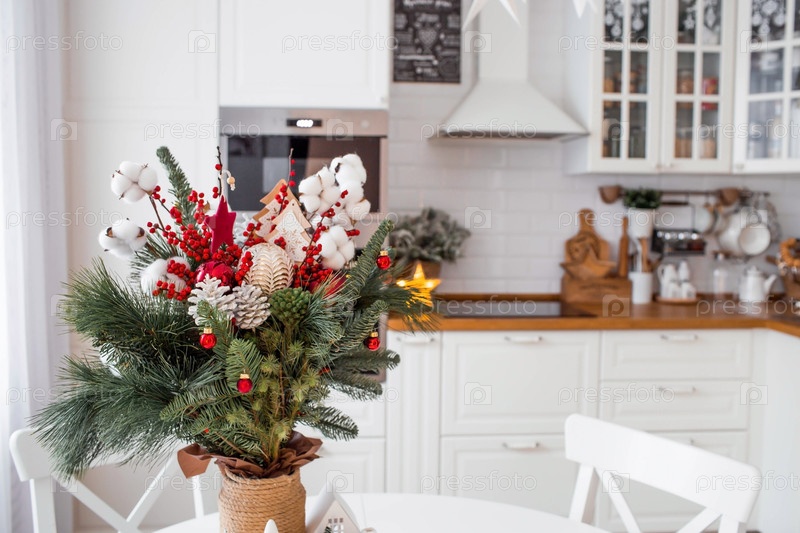 Еловый букет с красными ягодами, игрушками, хлопком на белом кухонном столе. Новогодние украшения в интерьере. Концепция подготовки к новогоднему празднику 2024