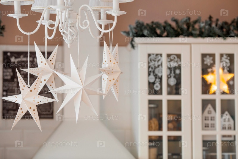Белые скандинавские бумажные звезды в новогоднем украшении кухонного интерьера. Концепция подготовки к новогодним праздникам 2024 года