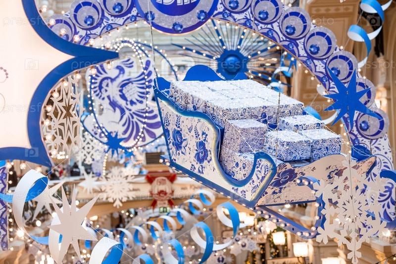 Рождественское украшение улиц. Красивые праздничные пейзажи города. ЖВАЧКА. Центральный магазин на Красной площади. Украшение в стиле Гжель. Москва, декабрь 2023 г