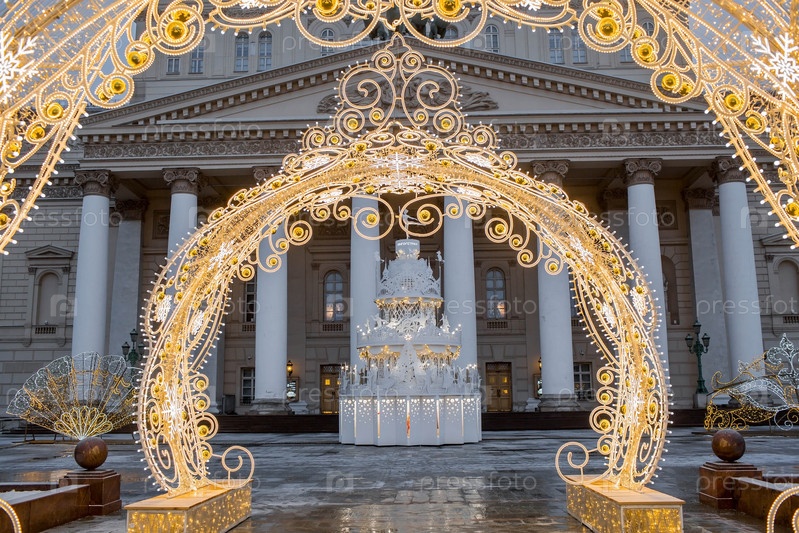 Новый год. Рождественские украшения на улицах Москвы. Рождественские каникулы, зимний пейзаж. Большой театр в центре Москвы. Россия, Москва, 2023 г