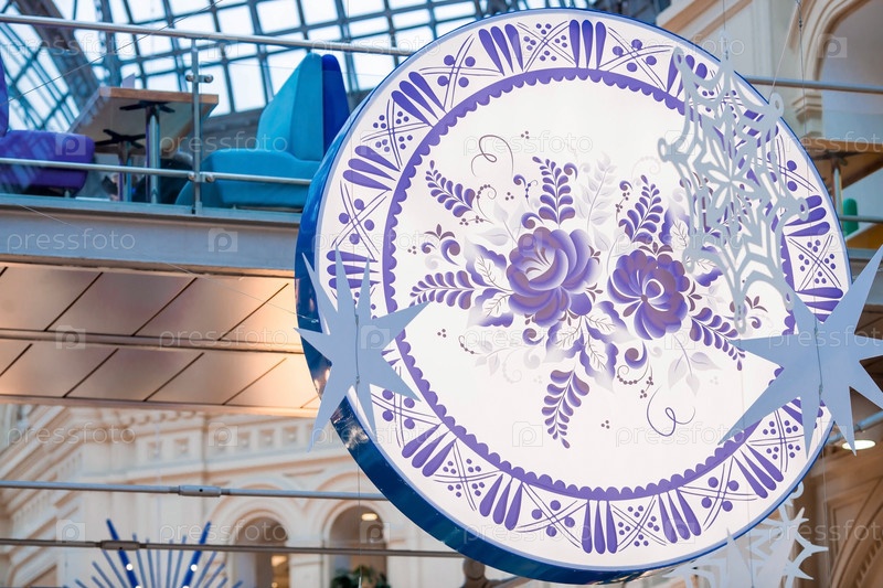 Рождественское украшение улиц. Красивые праздничные пейзажи города. ЖВАЧКА. Центральный магазин на Красной площади. Украшение в стиле Гжель. Москва, декабрь 2023 г