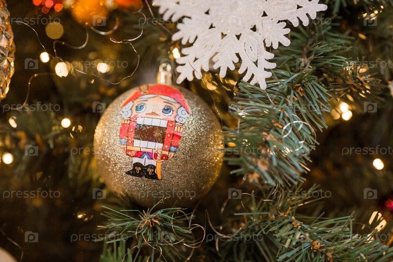 Красивые праздничные украшения на елку в красных и золотых тонах. Щелкунчик. Красивый рождественский фон. Новогодняя открытка 2024
