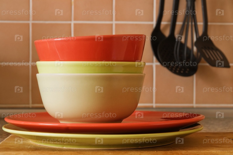 Тарелки на фоне светло-коричневой керамической плитки