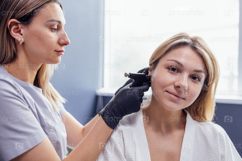 Крупный план лица молодой блондинки, делающей процедуру пирсинга ушей