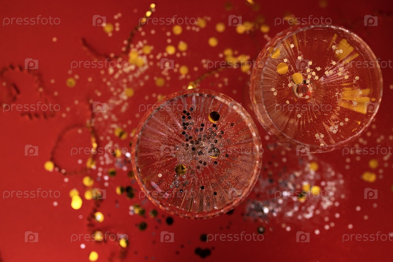 Два изысканных бокала шампанского с серебряными блестками и конфетти