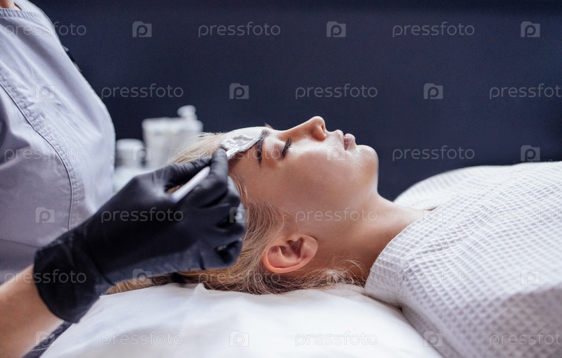 Косметолог наносит омолаживающую белую маску на лицо клиентки