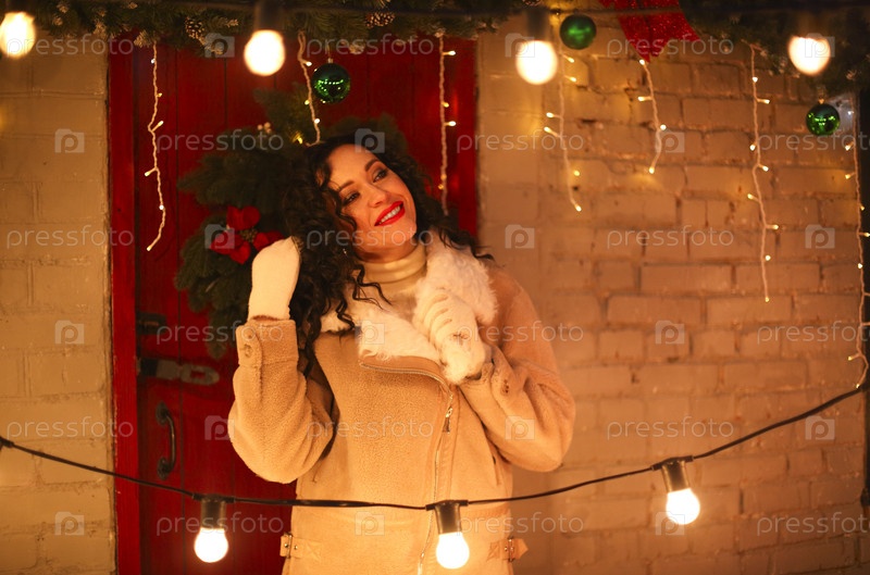 Рождественская девочка. Фотография на открытом воздухе счастливой женщины с закрытыми глазами, стоящей возле входа в дом, украшенной рождественскими лампочками и ветвями деревьев, женщина в праздничном макияже наслаждается праздничным сезоном