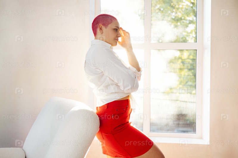 Красивая расслабленная женщина в легкой одежде и с рыжими волосами