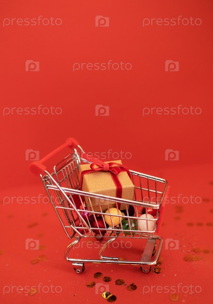 Миниатюрная корзина с подарком из крафт-бумаги на красном фоне